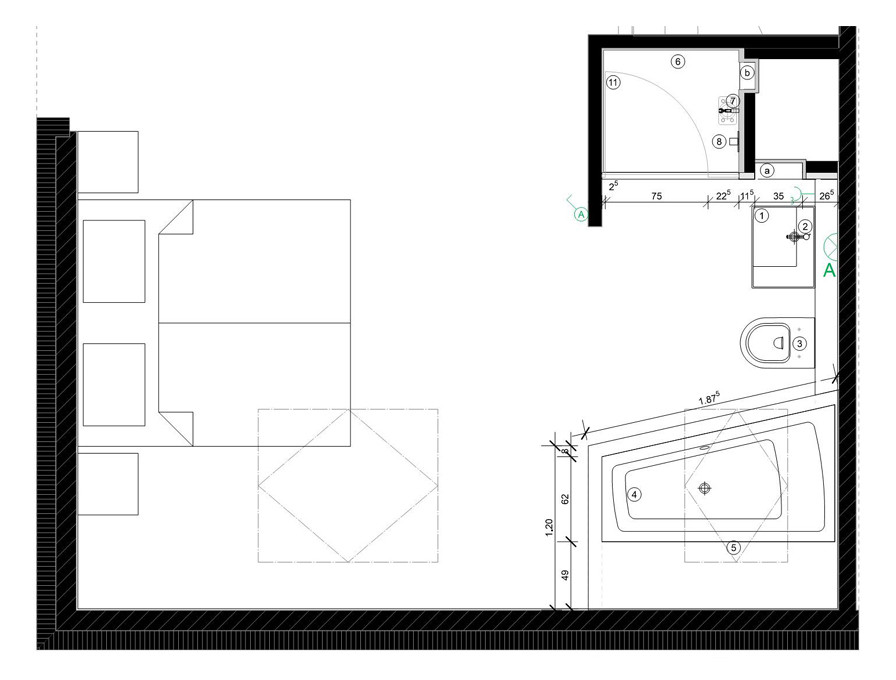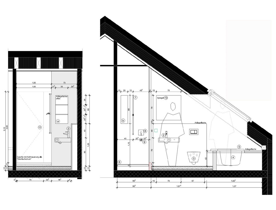 Gestaltung und Realisierung des neuen, zum Schlafraum offen gehaltenen Bads im Dachgeschoss.