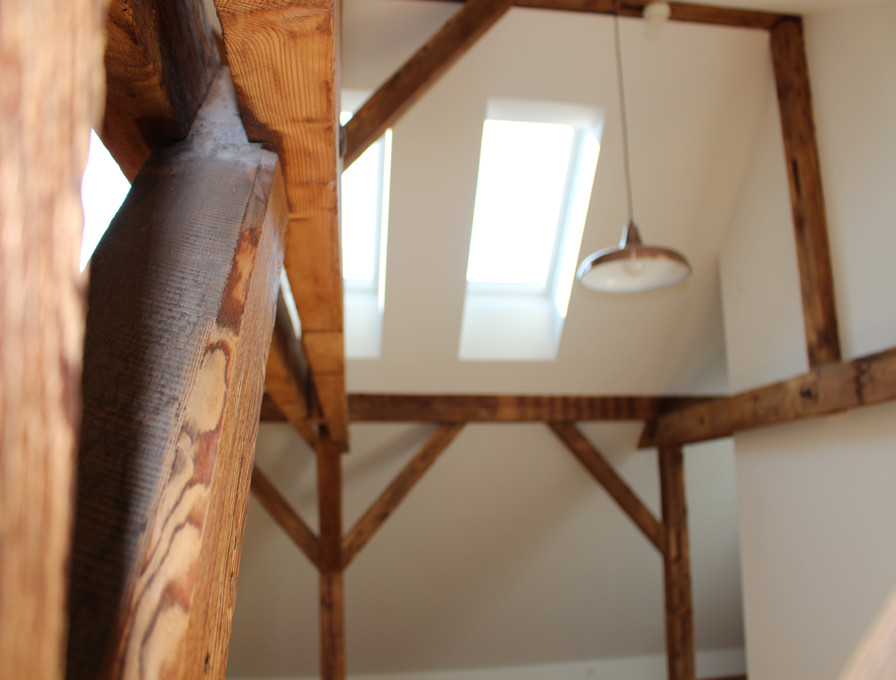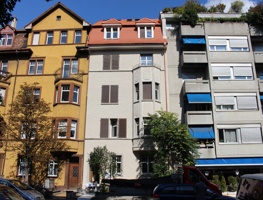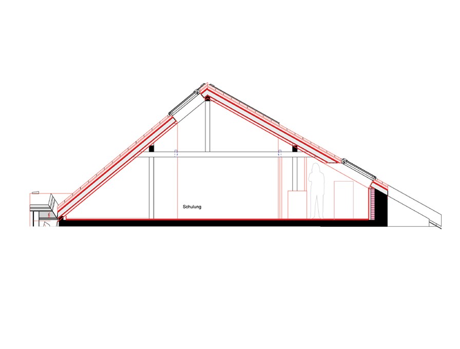 Dachstockausbau zu einem Schulungsraum mit WC und Teeküche. Einbau von Dachfenstern und Treppenhausoberlicht. Sanierung der Fassade.