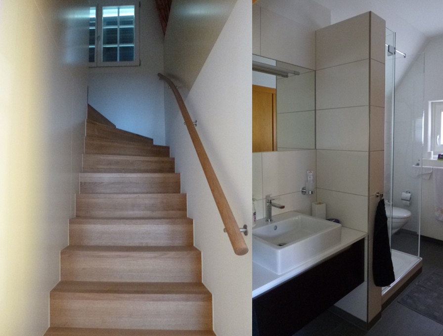 Setzen einer neuen Treppe. Sanierung aller Boden-, Wand- und Deckenflächen im Obergeschoss.